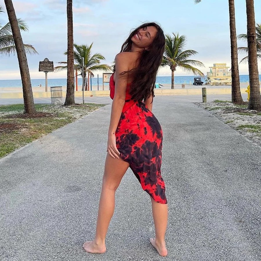Asymmetrical one shoulder dress featuring a beautiful tye dye color with a leg slit